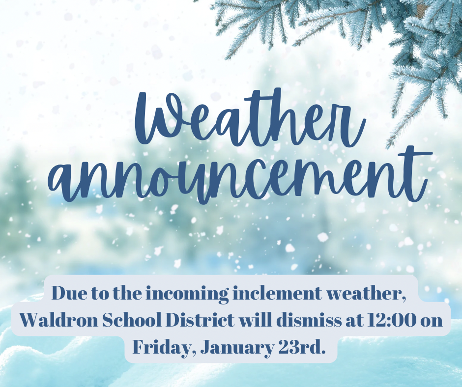 Because of these factors, and out of an abundance of caution, Waldron School District will operate on an early release schedule on Friday, January 23, with dismissal at 12:00 p.m. I sincerely hope the forecast with minimal impact proves to be correct and that conditions remain dry at release time. However, we would much rather be wrong in hoping for clear weather than risk being wrong with student and staff safety. Our intentions are that all of our students and staff, including bus drivers, are back home before the major weather occurs.
